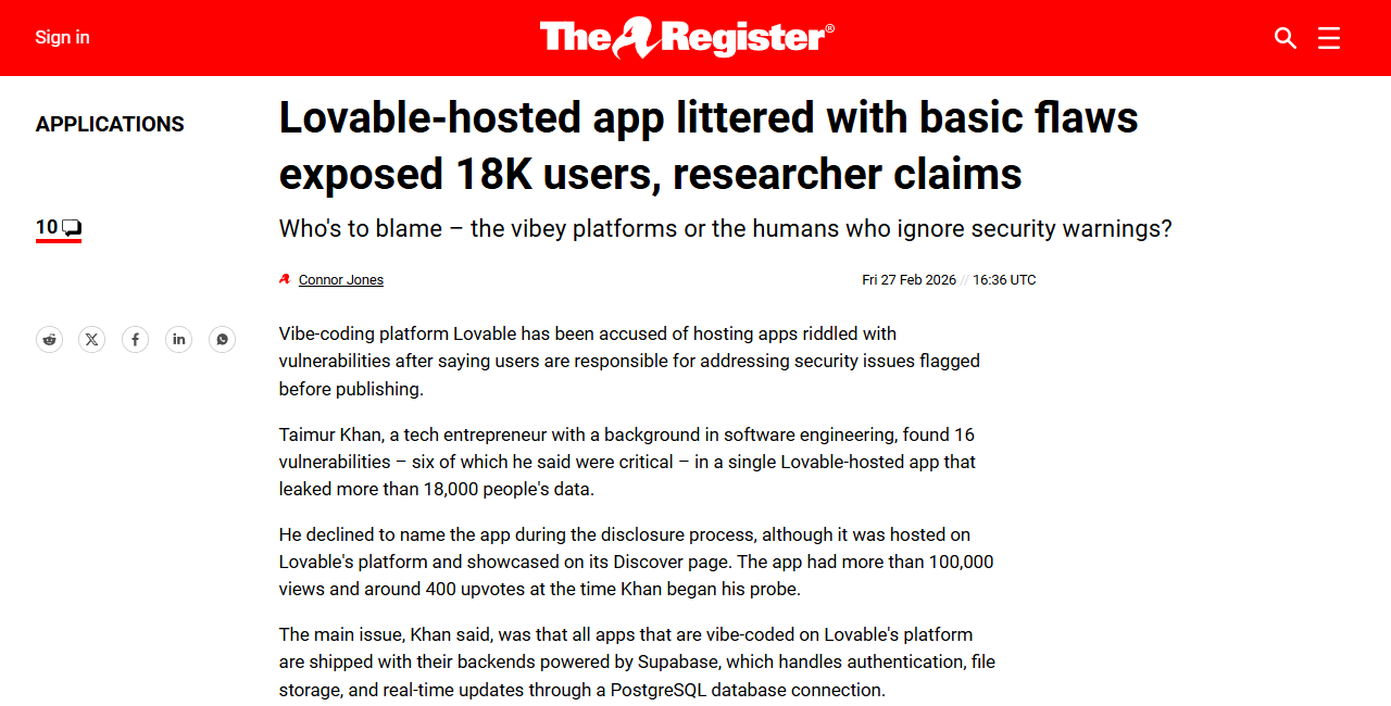 相关链接:https://www.theregister.com/2026/02/27/lovable_app_vulnerabilities/