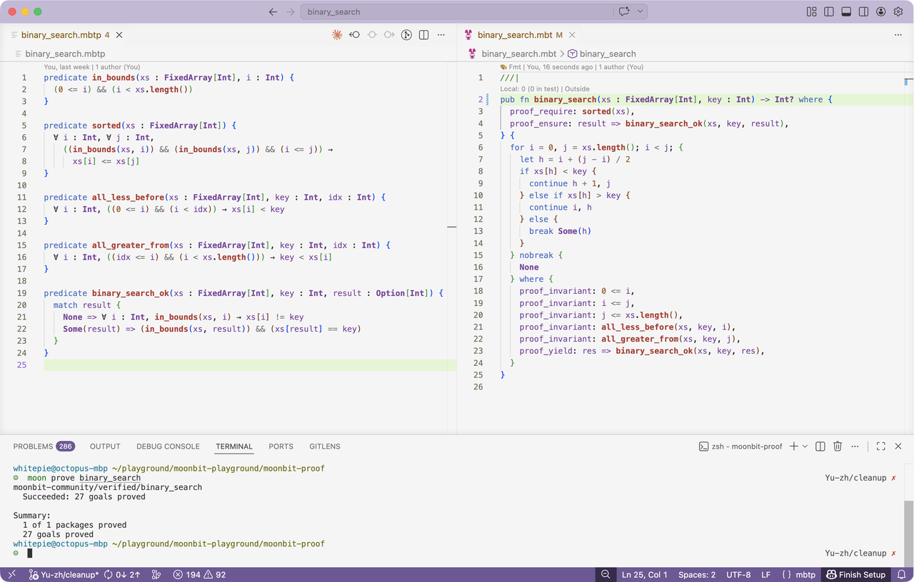 上图展示了 MoonBit 中对二分查找的完整验证。左侧是带有合约和循环不变量的函数实现,右侧是谓词定义文件,底部终端显示验证全部通过。