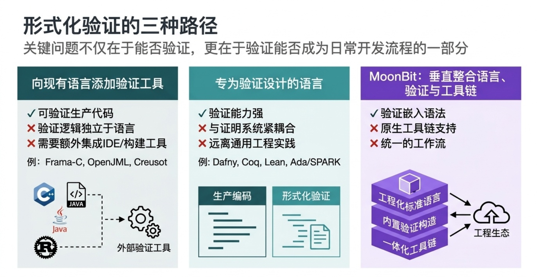 这类方案的优势在于可以直接验证生产代码,但它们面临一个结构性问题:验证和语言是分离的。合约和规范只能通过注释或宏注入,对语言本身而言是不可见的“外挂”。这意味着 IDE 无法原生理解验证注解,补全、跳转、错误提示都需要额外的插件支持;构建系统不知道验证步骤的存在,开发者需要手动维护额外的工具链;当语言本身升级时,验证工具往往要滞后数月甚至数年才能跟上。